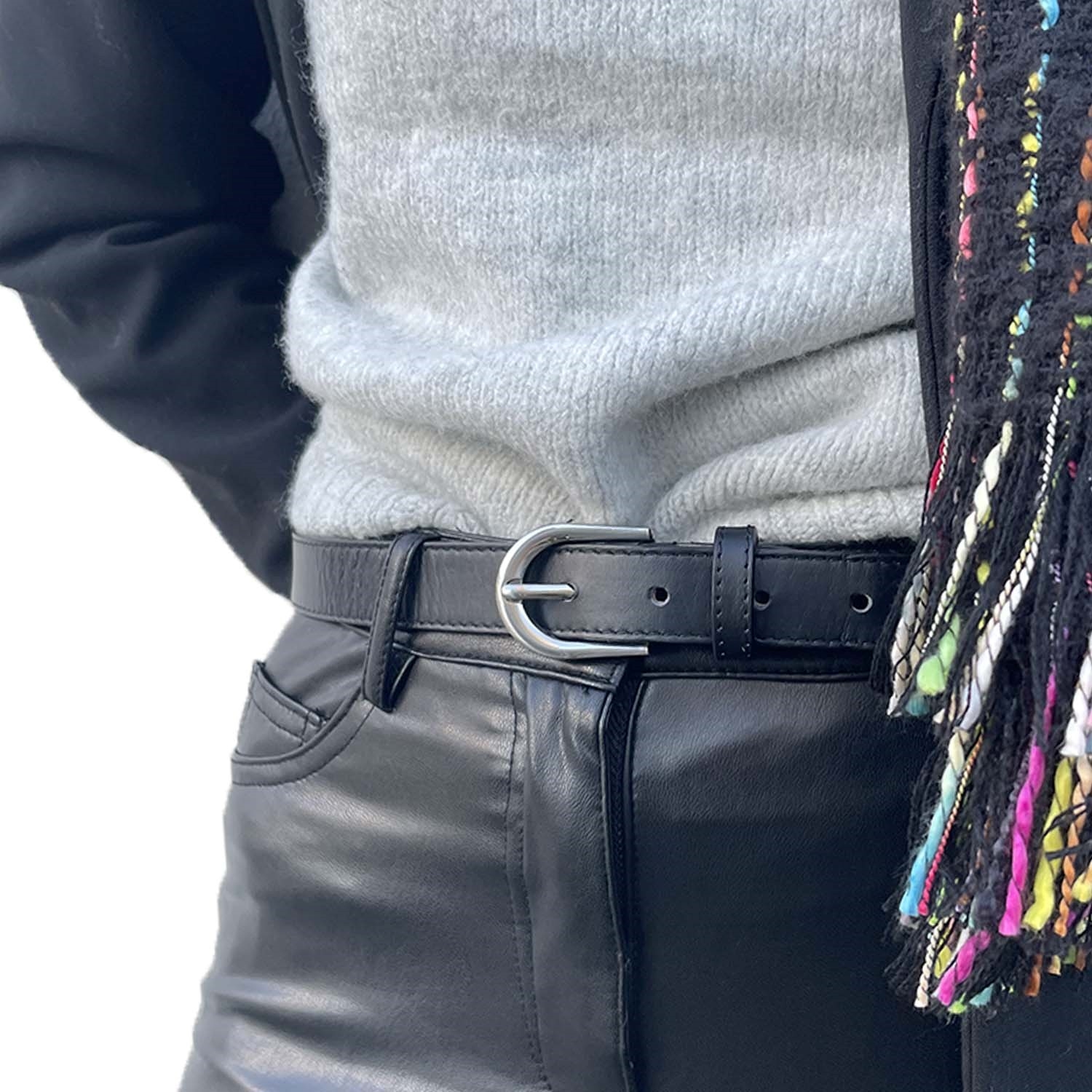 Ceinture très tendance. On adore le dessus cuir. Peut se porter avec un pantalon, une robe, etc. Largeur : 2.5 cm ; longueur : 90 cm. Modèle aussi disponible en camel et doré.