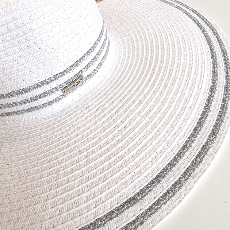 Magnifique capeline pour faire la belle tout l'été, que ce soit pour les vacances ou pour une occasion. On est fan de ses liserets métalisés. Au choix: blanc/argent ou naturel/or.
