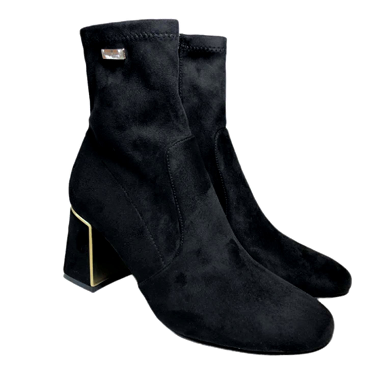 Magnifiques bottines noires au talon de 6 cm. Ces chaussures incarnent l'élégance, le chic. Sans oublier le détail doré qui fait la différence sur cette paire et qui apporte une touche de féminité. Ces bottines ne pourront que vous plaire mesdames. Fabriqué au Portugal.