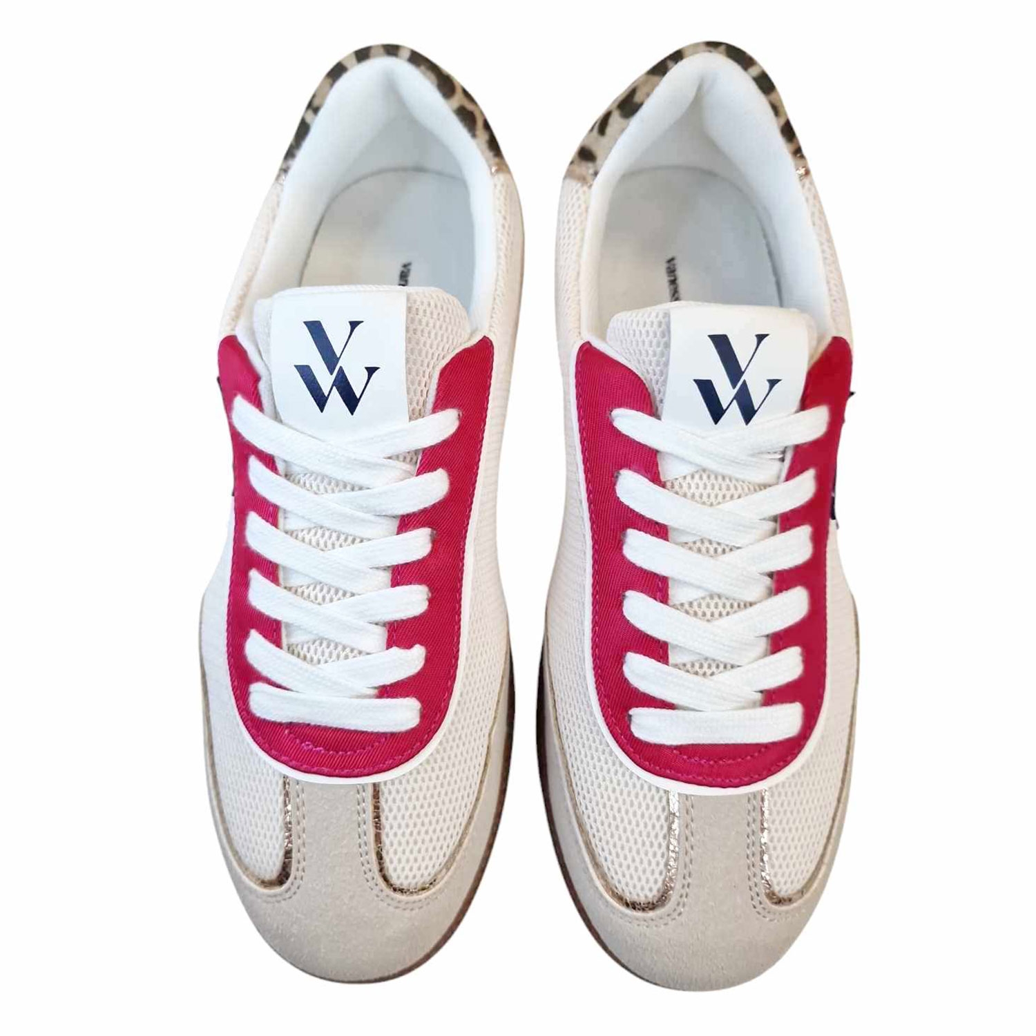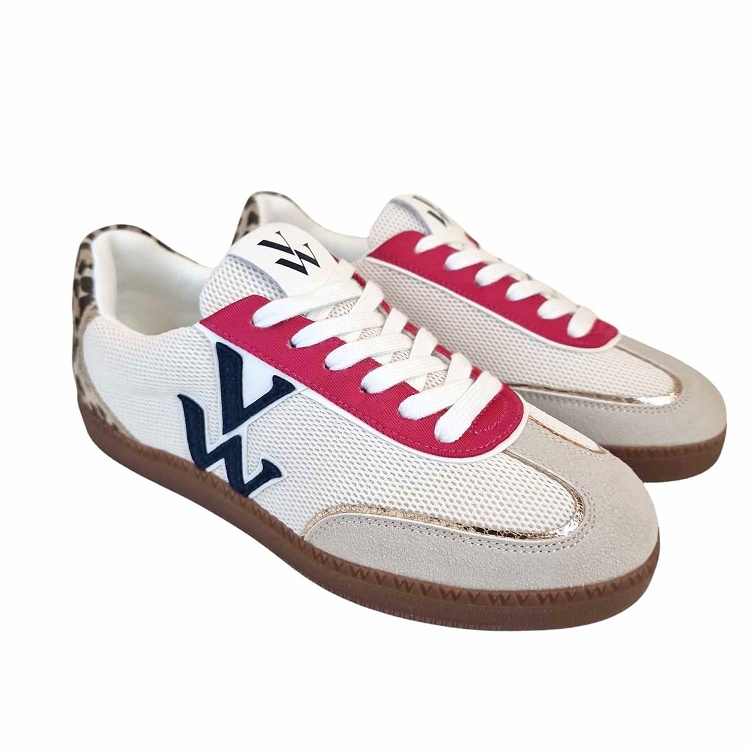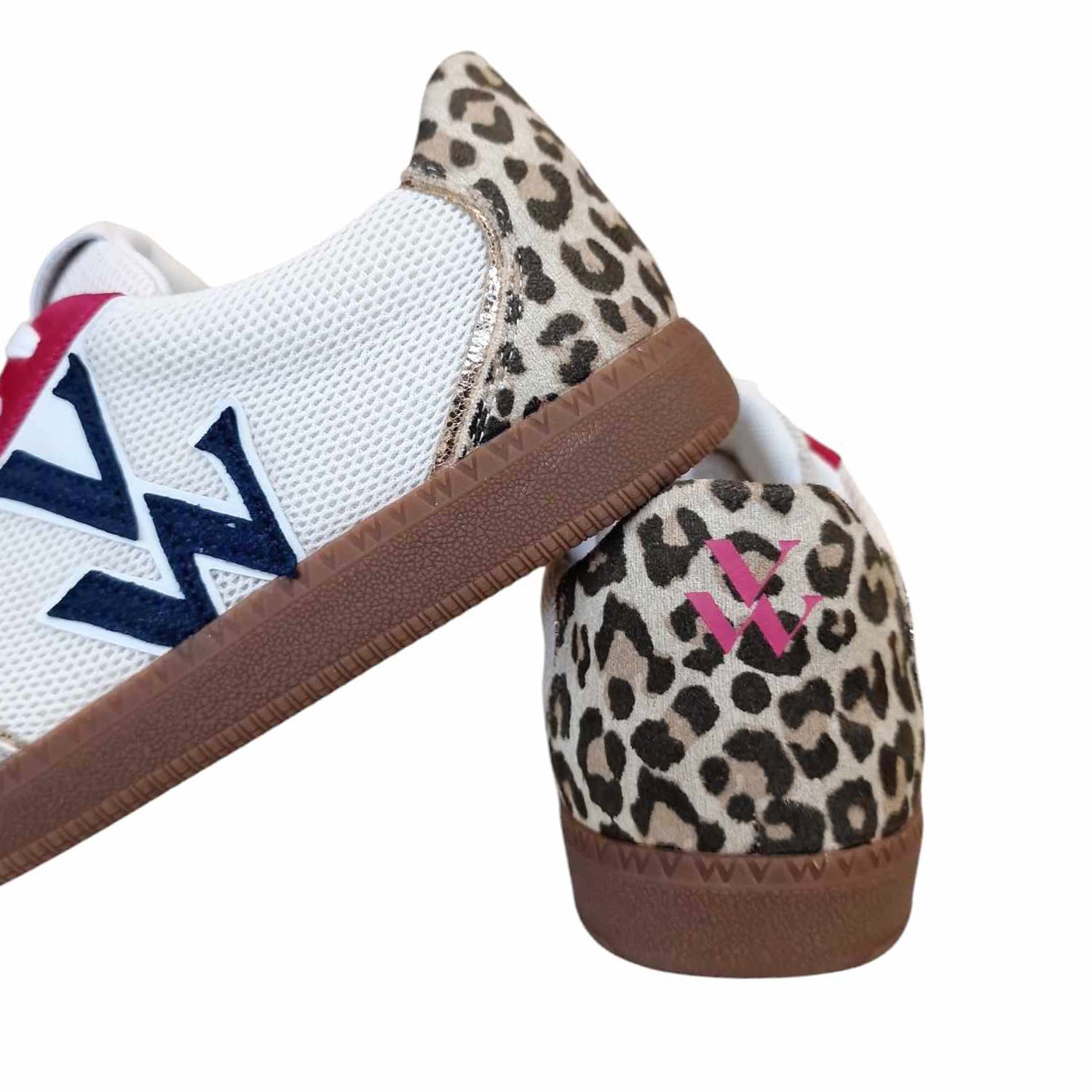 Sneaker rose et à motif léo. Semelle camel. Détail brillant à l'avant de la chaussure.