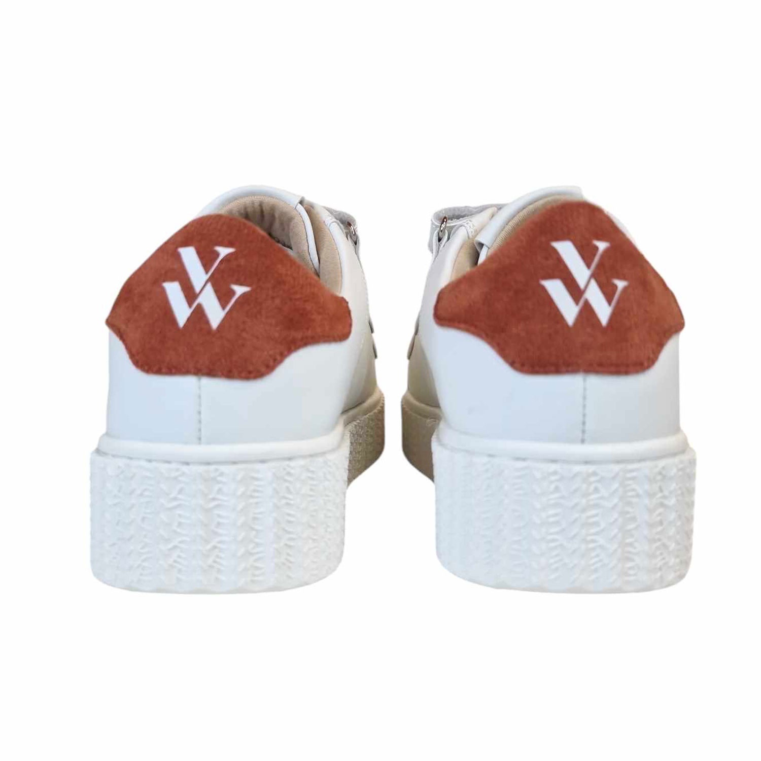 Sneaker blanche à scratch avec des détails de couleur brique. Ce modèle existe aussi en beige, kaki, noir et doré.